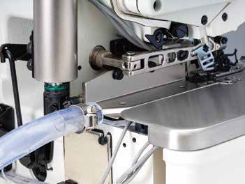 ?最高缝制速度达到6,500sti/min?直驱电机采用光栅定位,反应灵敏、准确?机头主轴采用整体通轴设计,传动刚性更好、损耗更少?自动剪线、自动抬压脚、除尘装置等功能选择灵活