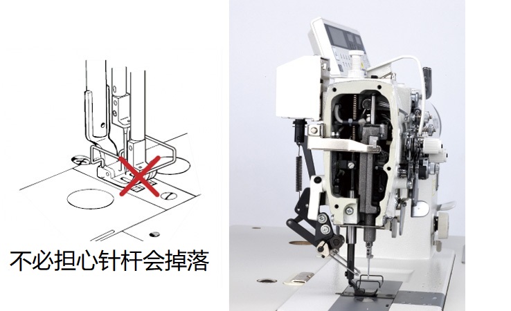 在高速缝制中,即使误接触停止杆,由于配备有安全结构,因此不用担心针杆会掉落。缝制作业应充分考虑操作安全性,此外还应避免缝纫机的致命性损坏。