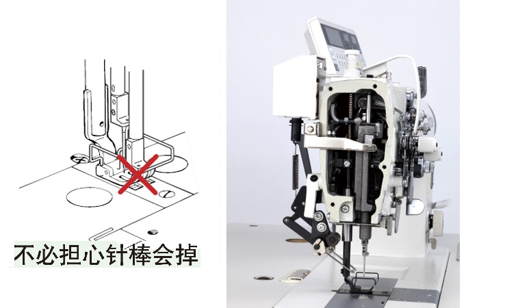 在高速缝制中,即使误接触停止杆,由于配备有安全结构,因此不用担心针杆会掉落。缝制作业应充分考虑操作安全性,此外还应避免缝纫机的致命性损坏。