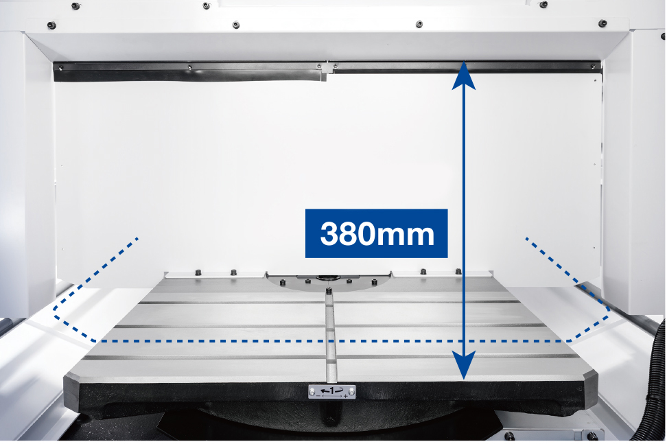只要是在工作台的旋转直径范围内,可搭载略超于工作台的夹具。选择可提升夹具高度的低床身工作台规格、可扩展夹具宽度的回转直径扩大等选配项,可进一步扩大夹具范围。